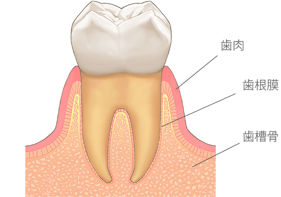 歯には歯根膜(しこんまく)という組織が付着しています。歯根膜は、歯とその土台となる骨(歯槽骨)を繋いでいるとても薄い組織です。